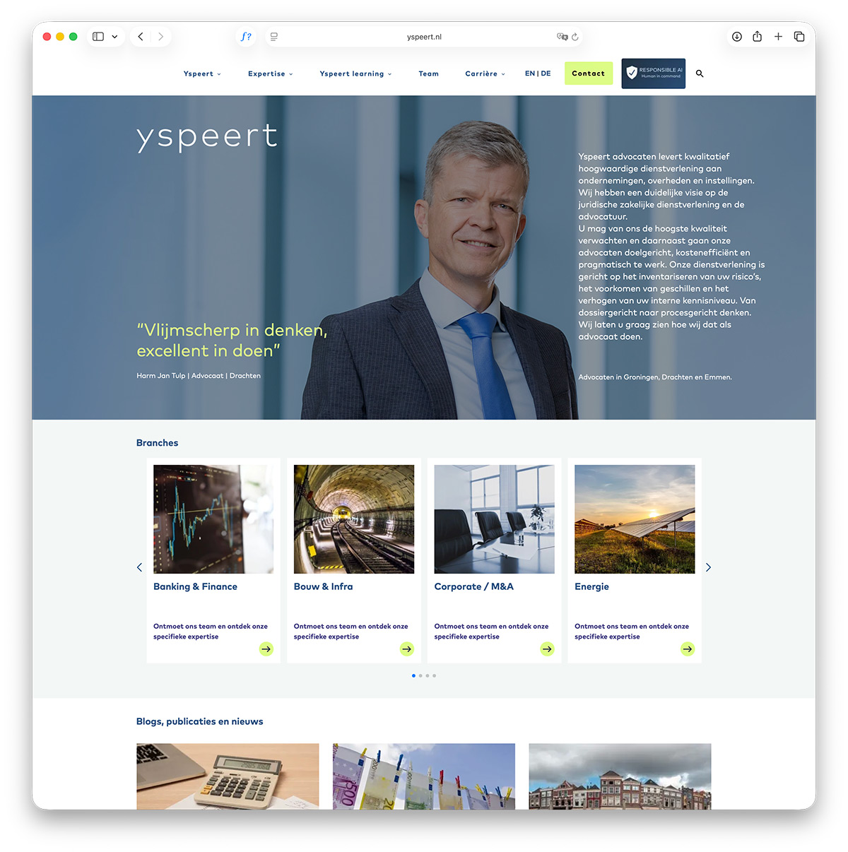 Als onderdeel van de door mij ontwikkelde huisstijl voor Yspeert advocaten heb ik ook de restyling van de website verzorgd. Het kleurenpalet dat ik voor het bedrijf ontworpen heb is een heel spannende. Vooral online komt die combinatie van een de donkerblauw met neon-groen goed tot zijn recht.